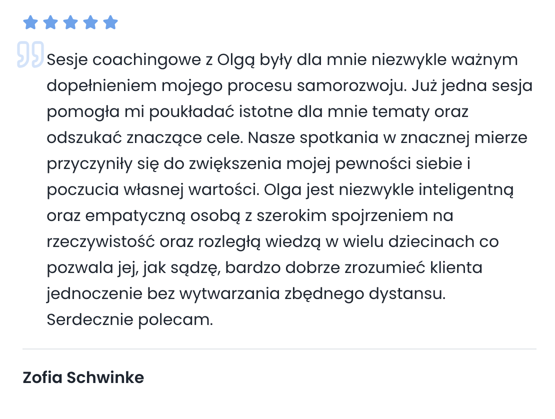 Wszystko zależy od Twoich potrzeb. Jeżeli chcesz odnaleźć nowy cel na życie lub przepracować perfekcjonizm albo uzależnianie poczucia własnej wartości od swoich osiągnięć, niepowodzeń czy opinii innych, to takie tematy będą wymagały kilku spotkań i Twojej aktywnej pracy między nimi — wtedy wchodzimy w proces coachingowy. Jeśli natomiast masz decyzję do podjęcia albo jednorazowe wyzwanie, i potrzebujesz w tym wsparcia — jedna sesja może okazać się w zupełności wystarczająca.